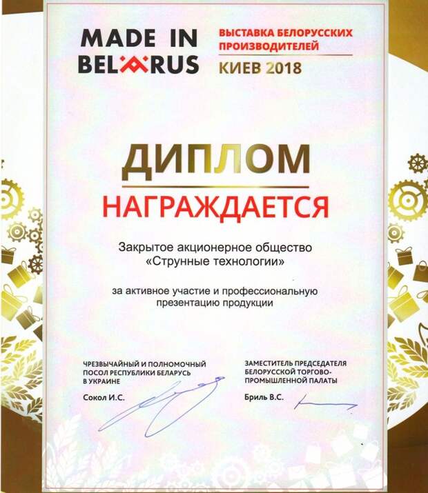 Приятным дополнением к медийному вниманию и продуктивным деловым контактам за кулисами стал и диплом за подписью чрезвычайного и полномочного посла Беларуси в Украине Игоря Сокола и заместителя председателя Белорусской торгово-промышленной палаты Вячеслава Бриля. Активное участие и презентация продукции для регионов по всему миру – одно из важных направлений деятельности компании, которая способна предложить отечественную разработку ряду стран.