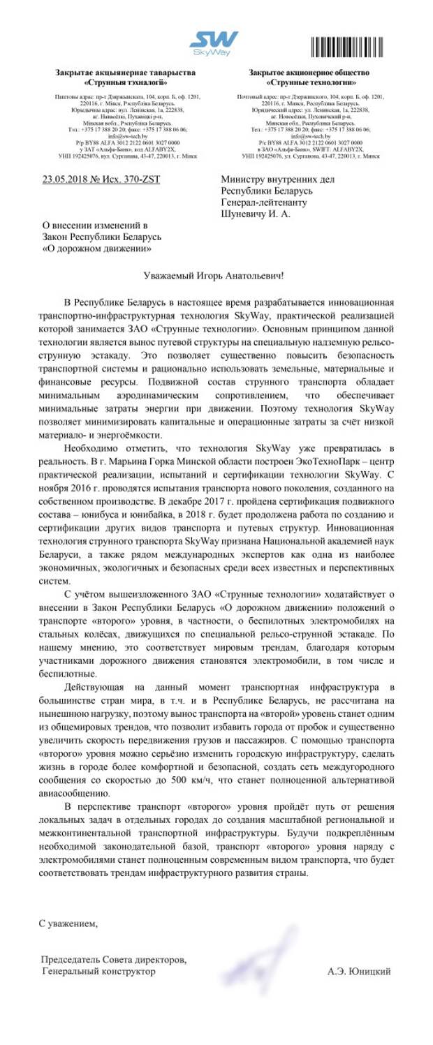 На основании того, что струнный транспорт уже почти готов к работе в транспортной системе страны, Анатолий Юницкий ходатайствует о внесении в Закон Республики Беларусь "О дорожном движении" положений о транспорте "второго" уровня, в частности, о беспилотных электромобилях на стальных колесах, движущихся по специальной рельсо-струнной эстакаде. Как подчеркнуто в письме, такое дополнение соответствует мировым трендам, в соответствии с которыми участниками дорожного движения становятся электромобили, в том числе и беспилотные.